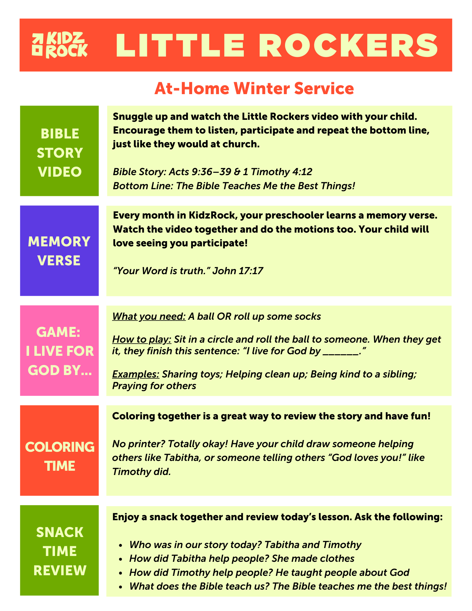 Use the lesson overview to guide you! You can start with worship, watch the lesson and memory verse videos together and enjoy some super simple activities.